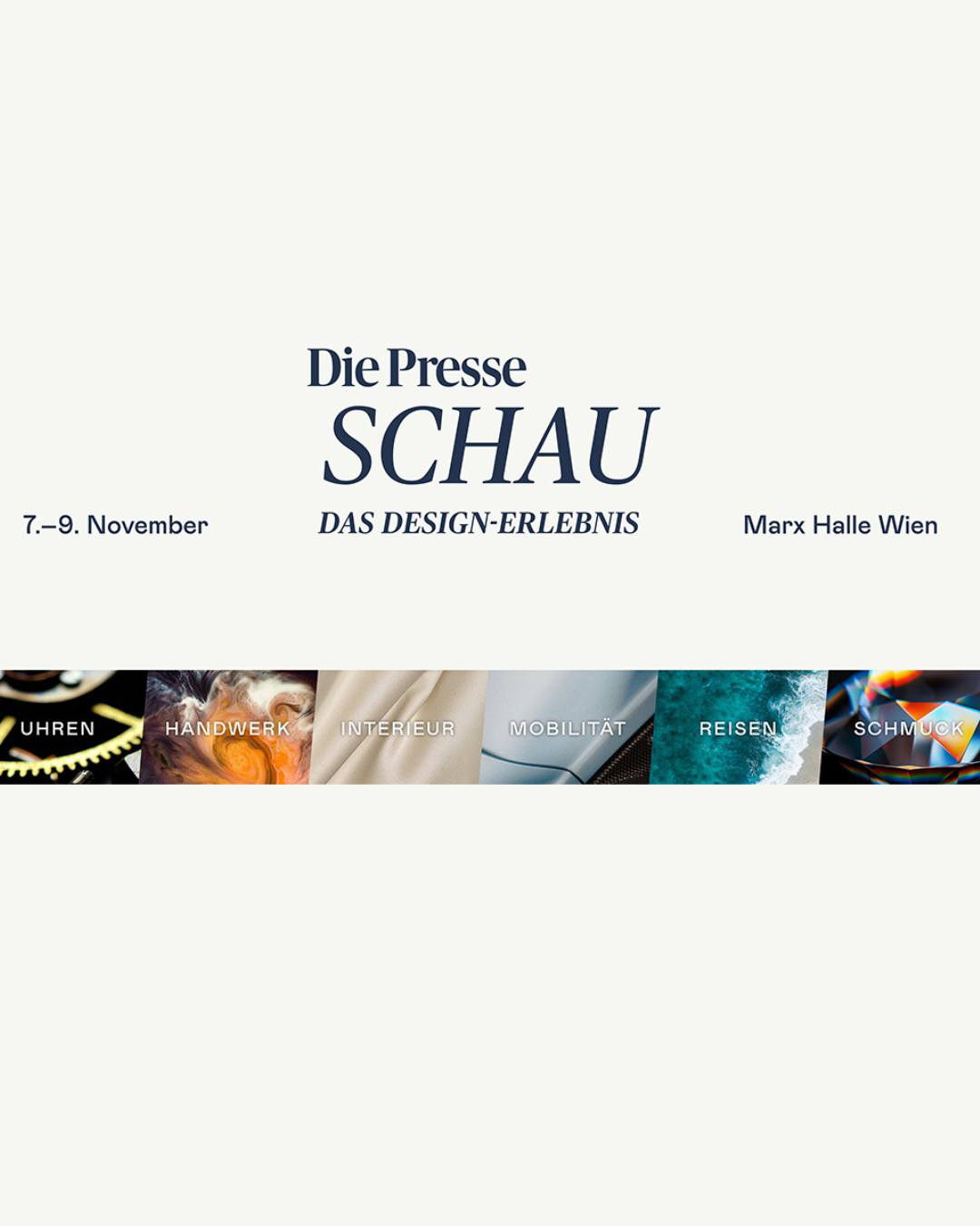 "Die Presse"-SCHAU lädt dazu ein, in einer besonderen Atmosphäre auf Entdeckungsreise zu gehen, denn wer das Schöne schätzt, findet in den sechs Themenwelten Uhren und Schmuck, Design, Handwerk, Reisen sowie Mobilität jede Menge Inspiration.