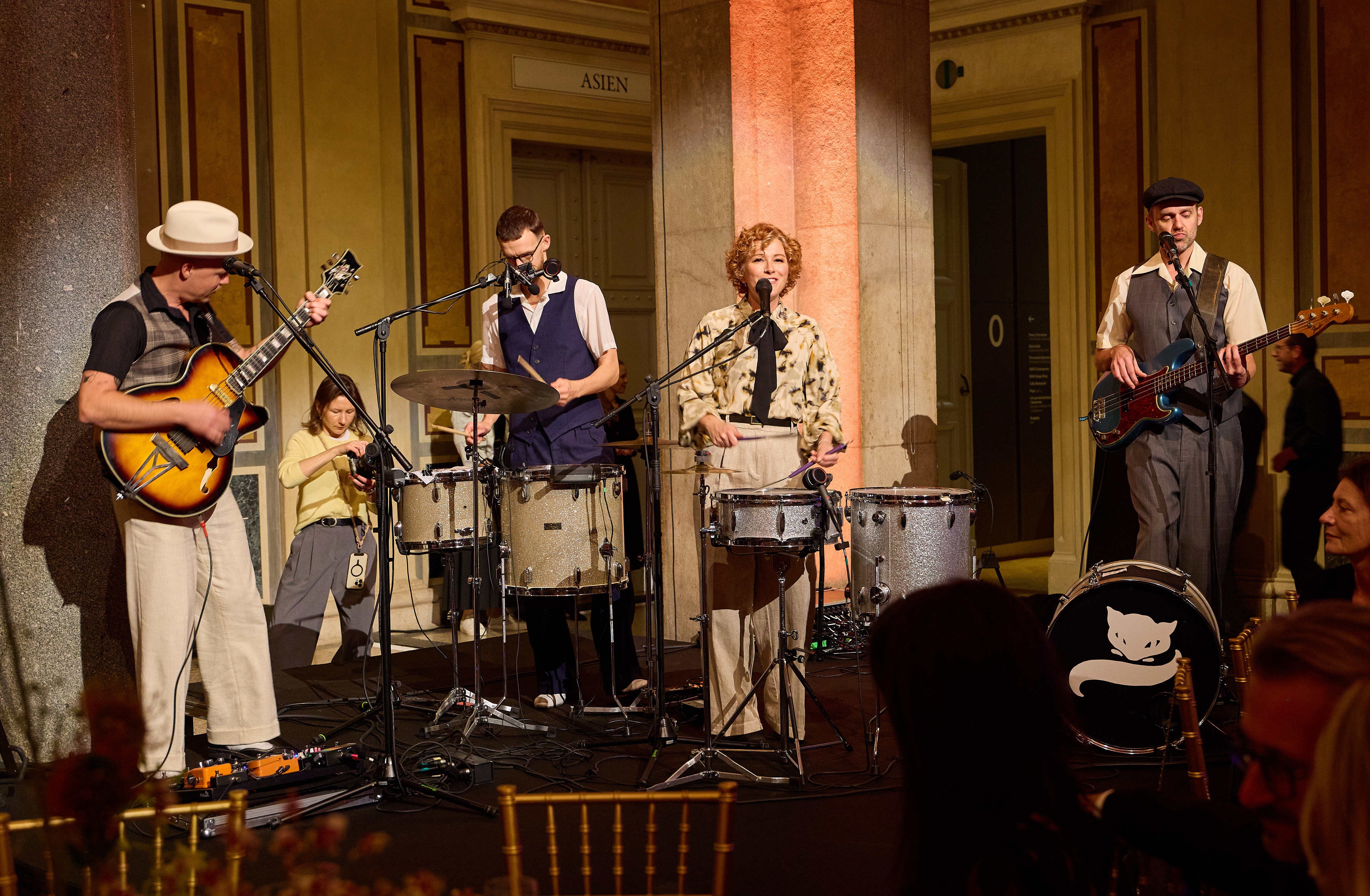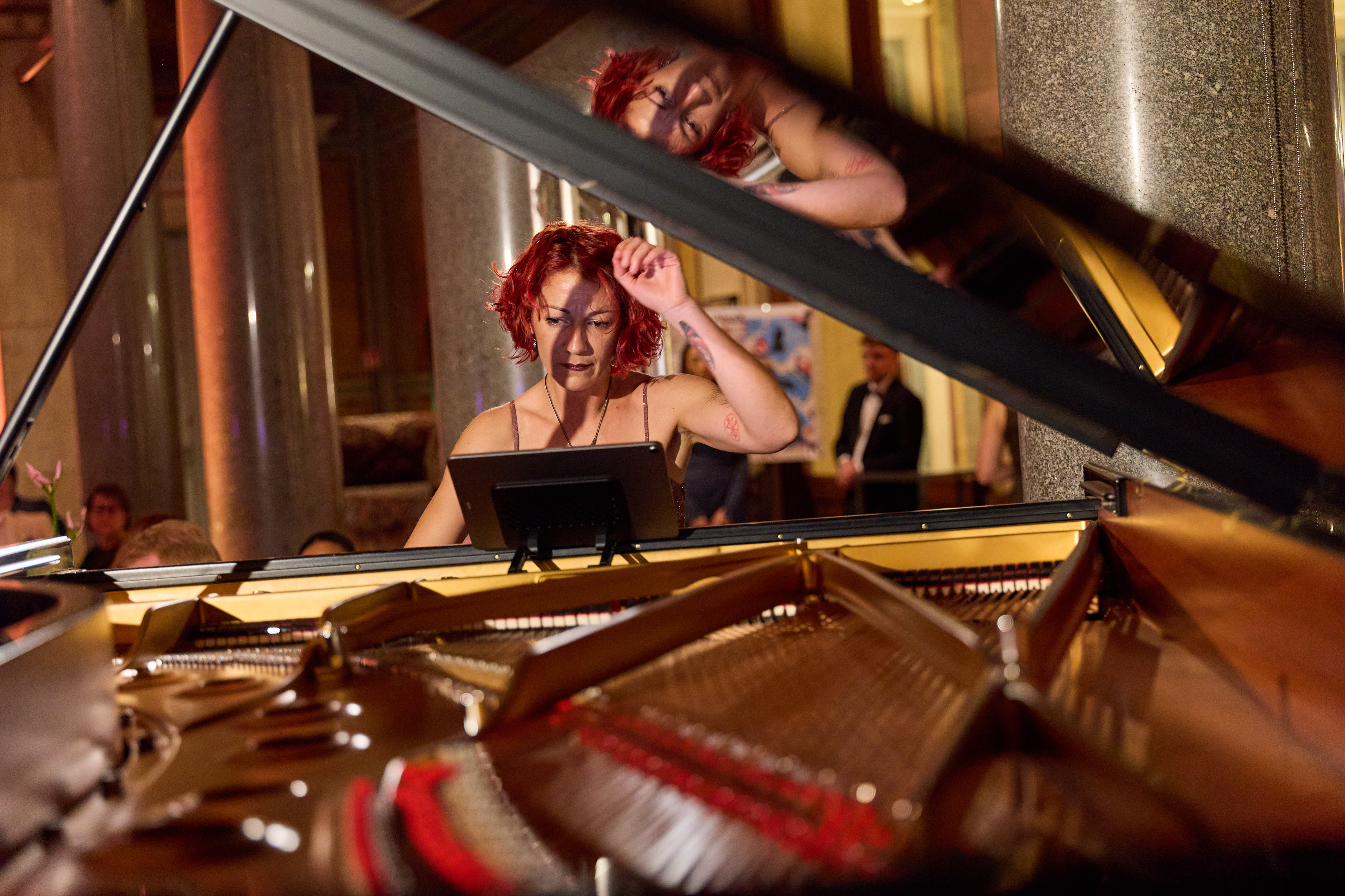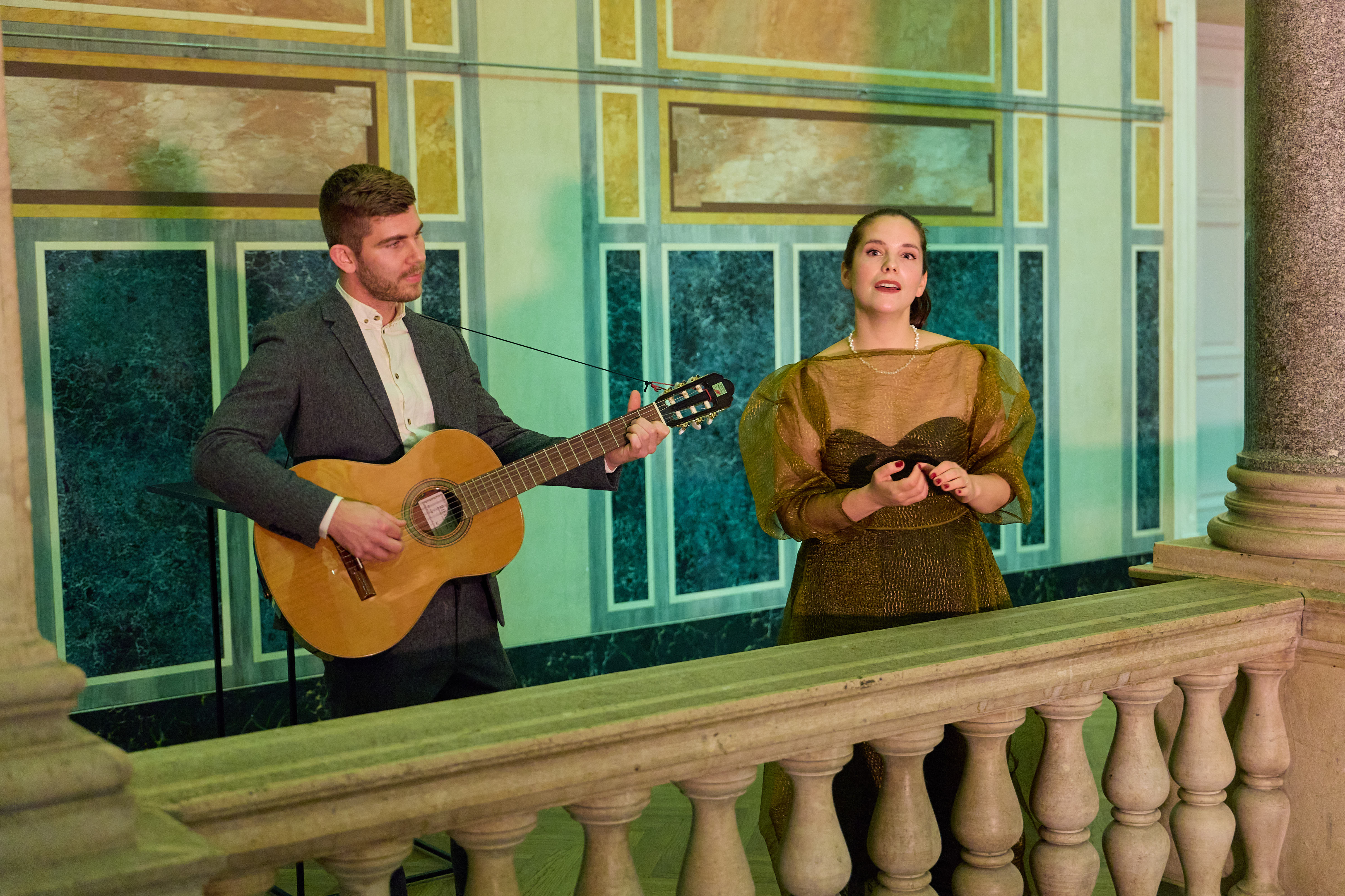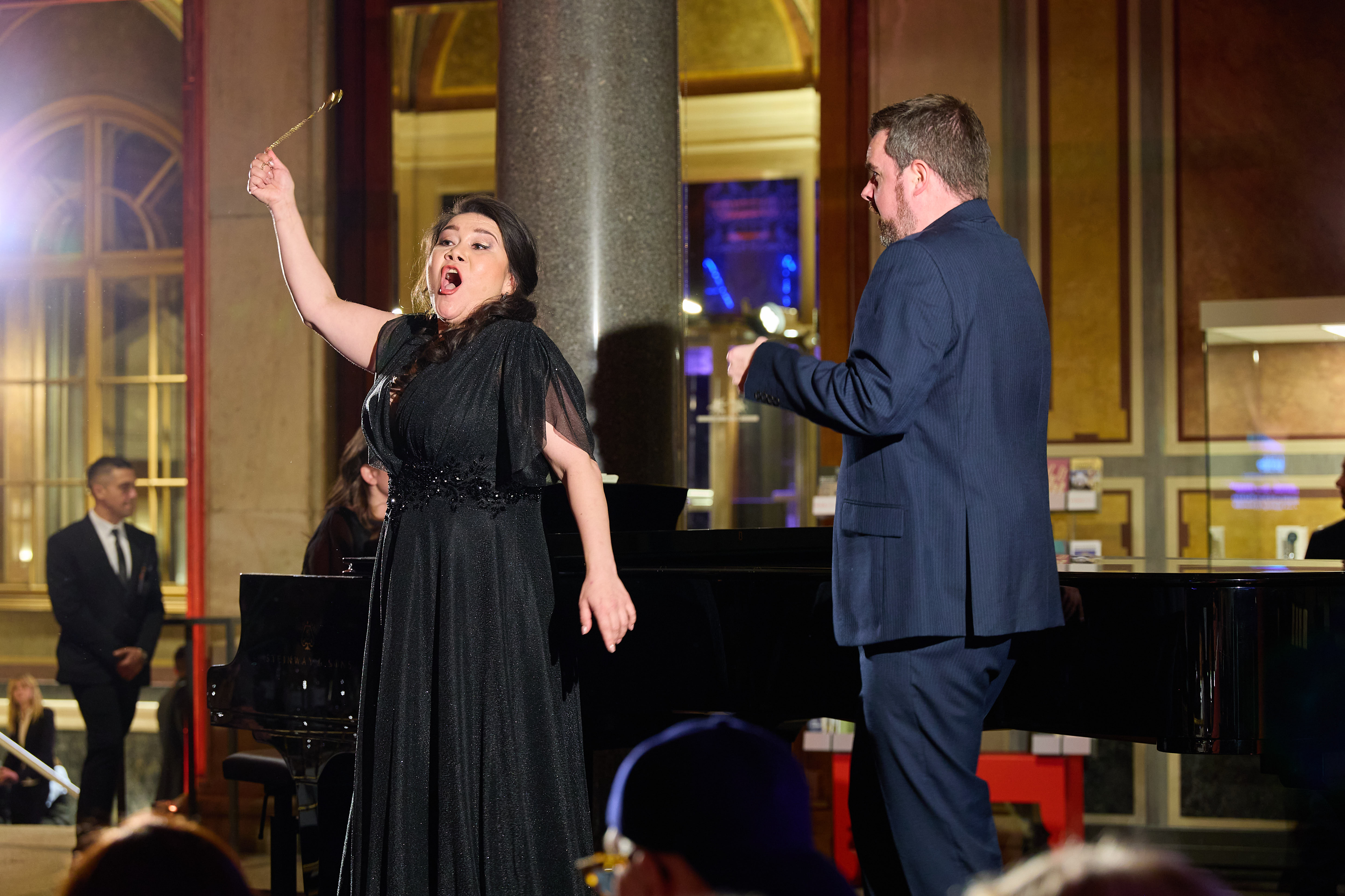 Die Künstler:Innen des Musik-Theater an der Wien begeisterten mit Auszügen aus Unsuk Chin´s „Alice im Wonderland“, die von Álfheiður Erla Guðmundsdóttir (Alice) in Begleitung von Hannah Eisendle gesungen wurden, Johann Strauss „Die Fledermaus“ wurde von Hulkar Sabirova (Rosalinde) und Ben McAteer (Eisenstein) in Begleitung von Hannah Eisendle dargebracht und das Stück "Dorma" in einer einmaligen Darbietung von Álfheiður Erla Guðmundsdóttir in Begleitung von Valgeir Daði Einarsson. Die virtuose Steinway & Sons Artistin Maria Radutu verzauberte die Anwesenden ebenso mit ihrem Auftritt wie auch die intime Performance von „Kollektiv tanzt.“ bei dem Rebecca Horner, Olga Esina und Florian Carove performten. Als dann noch die Neo-Swing-Band Marina & The Kats rund um Sängerin und Songwriterin Marina Zettl auftrat, war die Stimmung am Höhepunkt. Und auch danach, als sieben Artists des MUK Jazz Department den Weg in die Aussstellungsräumlichkeiten fanden und eine beeindruckende Performance abgeliefert haben.