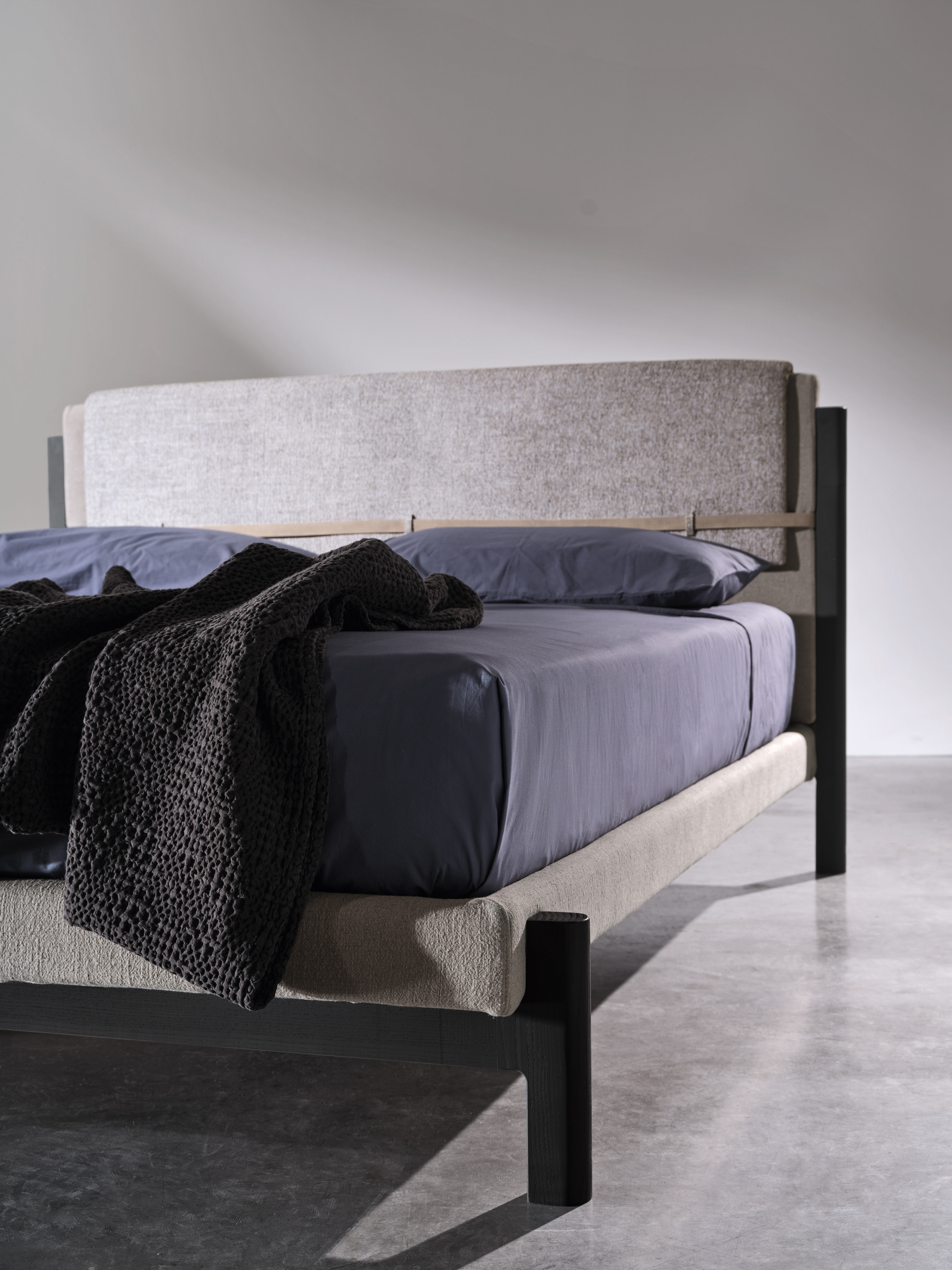 Das Bett Strap ist mit seinem eklektischen und zugleich schlichten Design definitiv ein Blickfang in jedem Schlafbereich und besticht mit einer raffinierten Kombination aus Materialien und Formen, die auch seinen einzigartigen Charakter ausmachen. Das Kopfteil aus Eschenholz wird durch einen weich gepolsterten Einsatz aufgewertet, der sich wie eine Decke über die Struktur legt, während die Polsterung mit einem eleganten Riemen aus Ökoleder befestigt ist – ein innovatives und unverwechselbares Detail, das Strap einzigartig macht.