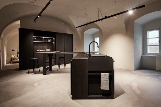 Diese Erfahrungen werden ab dem Jahr 2000 international vertieft - Architektur wird in der Schweiz und in Italien nicht nur studiert, sondern gelebt. Proportion, Material, Raumgefühl – all das prägt nachhaltig. 2001 folgt mit der Entdeckung ungenutzter Räumlichkeiten im Schloss Neuhaus ein entscheidender Moment: Ein Ort mit Geschichte wird zum Ort des kreativen Schaffens. Büro und Schauraum entstehen und mit ihnen die Erkenntnis, dass bestehende Küchensysteme den eigenen Anspruch nicht erfüllen können. Die Konsequenz daraus? Die Entwicklung eines eigenen Systems.